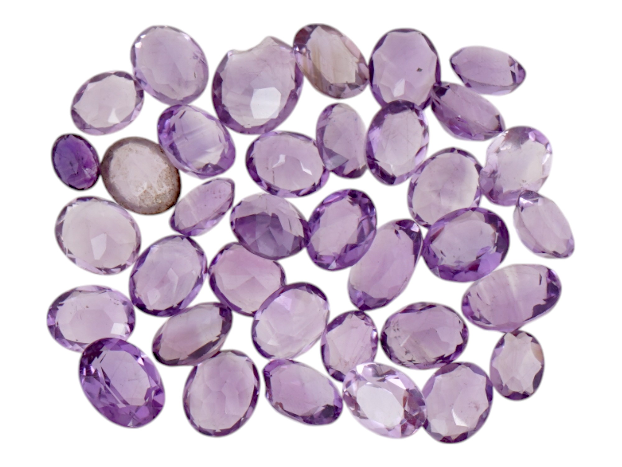 A collection of faceted amethyst gemstones. The stones are predominantly oval shaped, with various sizes and shades of light purple color. Vintage and Modern Natural Stones, Necklaces, Jewelry, Gifts And Accessories For Women.